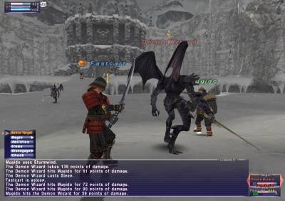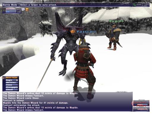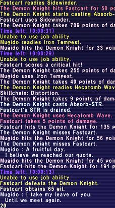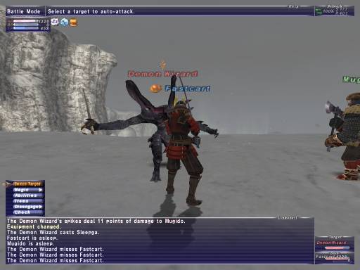 This seems weird. But, after the most recent maintenance, Black Mage mobs seem to cast more AoE spells. Although, I must admit I never xped on Black Mage mobs much with an NPC before the August 1st maintenance. Anyway, this is an example of what happens when Demon Wizards sleep us now. Miss, miss, intimidated, miss some more, dies.