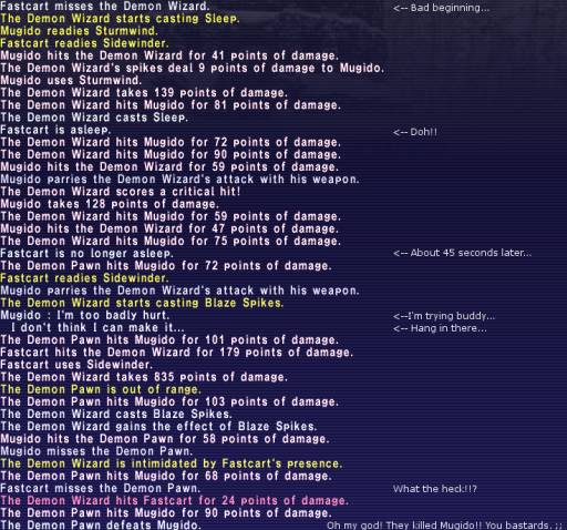 This was after our fourth fight of the session... The purpose the small picture on the left is just to show me sweating bullets while being slept. And, it wasn't because I was hot under that helm... This battle was bad start to finished. I engaged the Demon Wizard, missed, tried to use Sidewinder, but got slept before it fired. So, I never had hate. Meanwhile, Mugido immediately used Sturmwind upon engaging and didn't miss. A little while later, a Demon Pawn linked with the Wizard and started smacking Mugido too. I tried to get hate back as soon as I woke, but... Well...the screen shot on the right tells the rest of the story (with comments)...