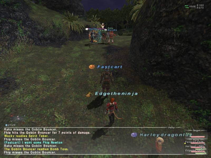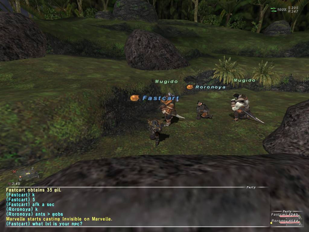 We went to our regular camp at the right Yhoator Jungle/Ifrit's Cauldron zone-line, but found these four there. I saw another Raka (Btaru's NPC is named Raka too) and Fhig. I couldn't resist throwing a comment out because they were at our spot (yes ours because everyone else borrows it). d: