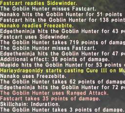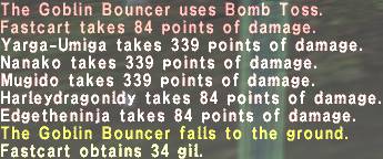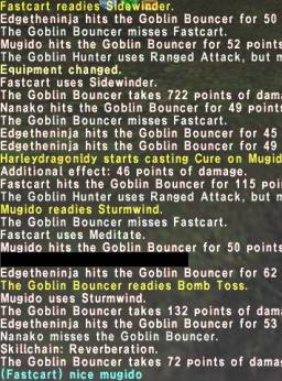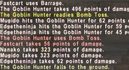 Let this be a lesson folks. Do not use Barrage on goblins that are near full health. The goblins have been crazy lately. This bomb left our NPCs at around 40% health. If Harl wasn't around, I'm sure Nanako and/or Mugido would have died. But then again if Harl wasn't around, I wouldn't have been as reckless. /grin