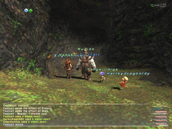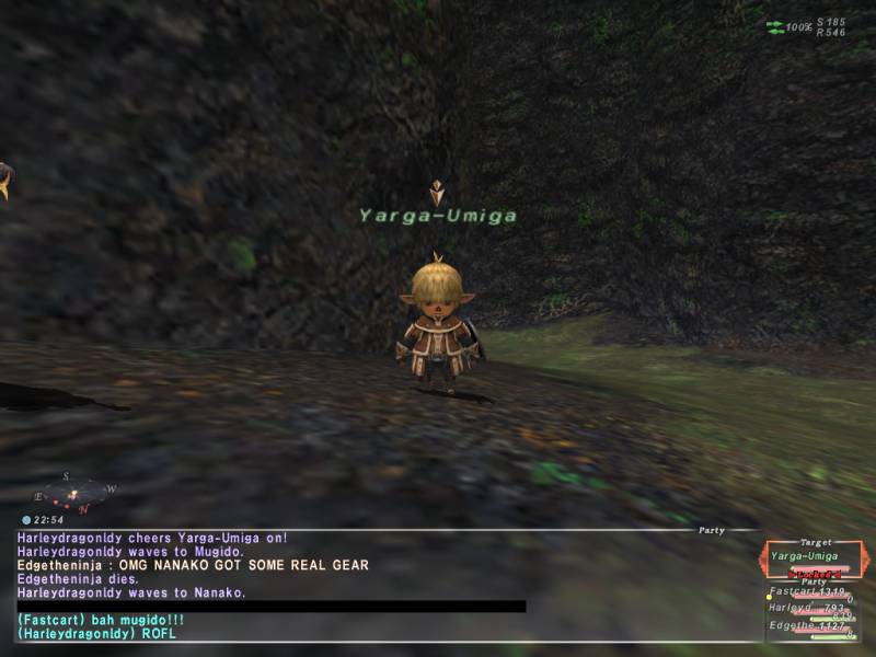 Anyway... Here's a couple of quick shots of today's adventure. Again, you can see how NPCs like to bunch together. I know you guys like to stick together, but sheesh... Yarga-Umiga's body and name can't even be seen, but that's Harl's fault. ^^ We had to go to the left Yhoator Jungle/Ifrit's Cauldron zone-line today because there was a party xping at our regular spot. Sorry for taking some of your mobs. We didn't know... ;;