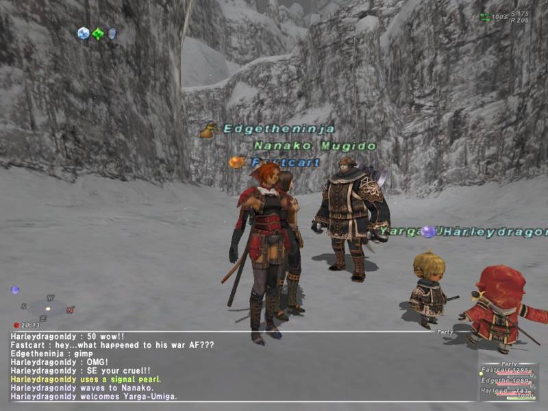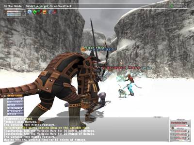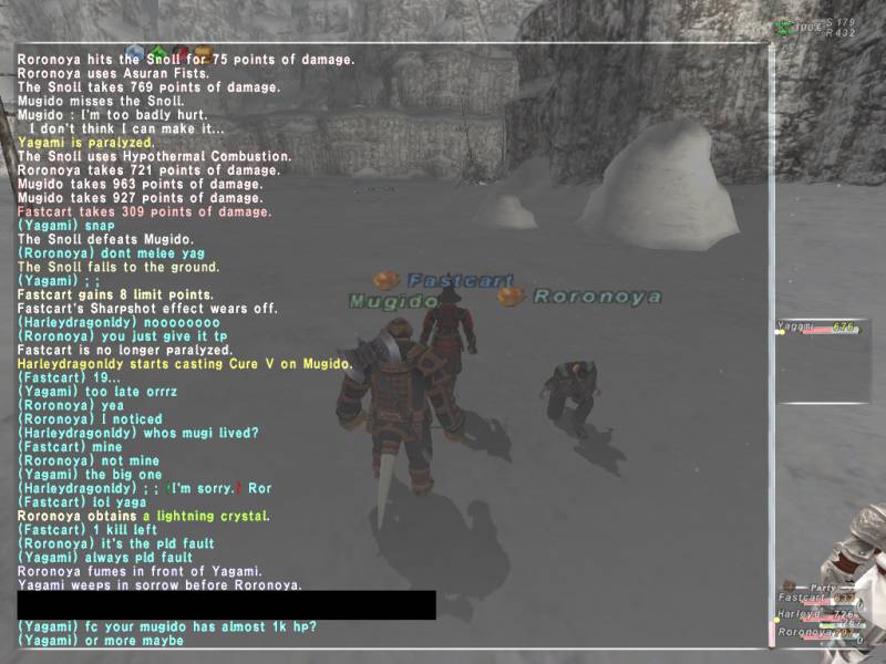 Roronoya and Yagami aren't use to how Edge, Harl, and I usually xp here. We normally camp by the zone, but we wandered around today. The fact that there was a Bst xping here on Snolls (ice bomb mobs) wasn't to our advantage either. Early in today's session, Harl's NPC died to a Variable Hare's Whirl Claws AoE attack. We ordinarily try to fight mobs away from Harl, but because it wasn't easy to do today since we were wandering.