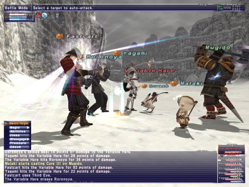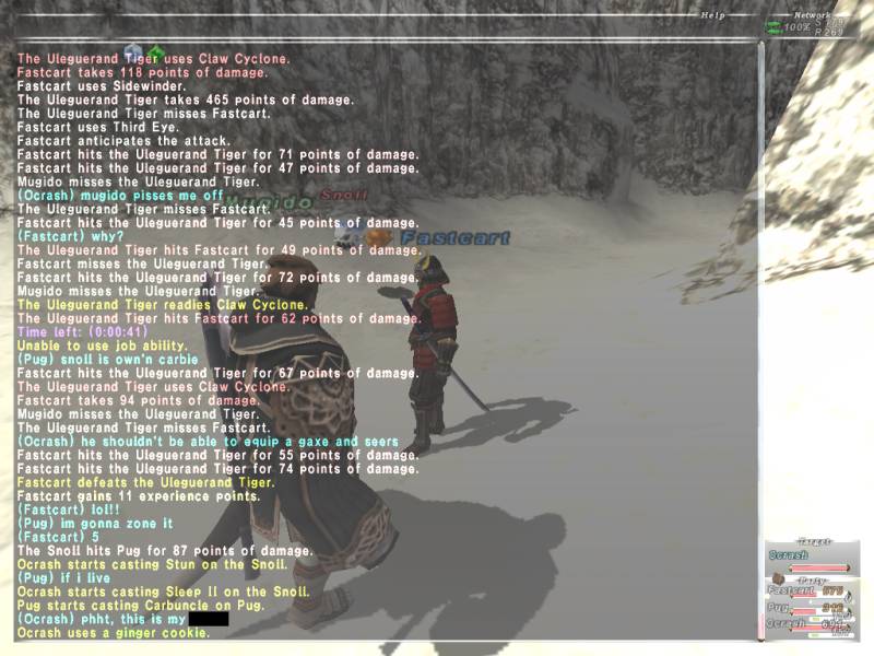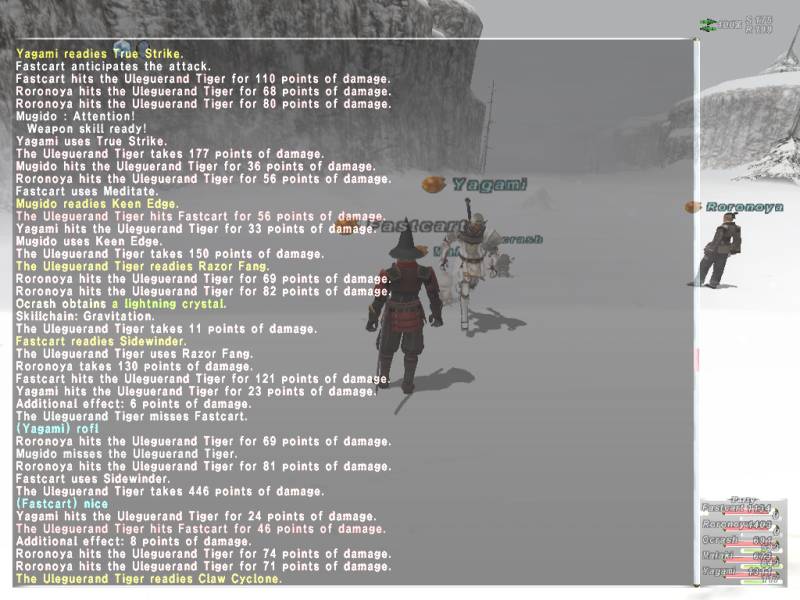 Here we are killing a poor hare. Ocrash was busy regaining mp for his nuke strike on a Snoll. He gets bored easy and wanted to make me squirm. To his credit, he knew what he was doing and helped us chain faster. Roronoya wound up tanking most of the mobs again.