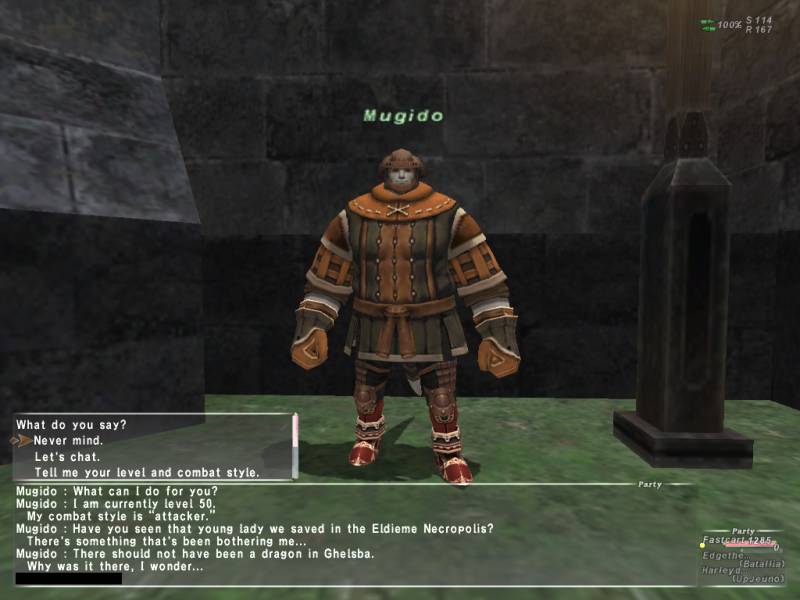 Hello all! Welcome to Mugido's, my NPC's, page. I decided to document stuff for a while to assist people who are having issues with their NPC. So, first off is the boring stuff. You can get your NPC through the Fellowship Quest. Minimum requirements seem to be Rank 4, a certain level of Jeuno fame, and a job of level 30 or higher. If you aren't sure whether you meet the requirements, just talk to Luto Mewrilah and see what she says.