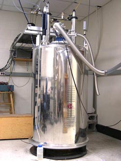 The 5 Tesla magnetic field consists of a two coil superconducting magnet (Magnex Corporation) with a 130 mm room-temperature bore. A small superconducting sweep coil allows for field sweeps of +/- 0.4 T. The low current required for field sweep (13 A) minimizes the helium boil-off rate. A home built NMR teslameter permits magnetic field settings and sweeps within 1 Gauss precision. The magnet is equiped with a flow cryostat (Oxford Instruments) for temperature control between 2 and 400 K.
