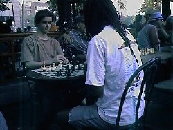 を、chessで楽しんでいる老若男女が一杯います。chess clockを叩き合って、時間切れ