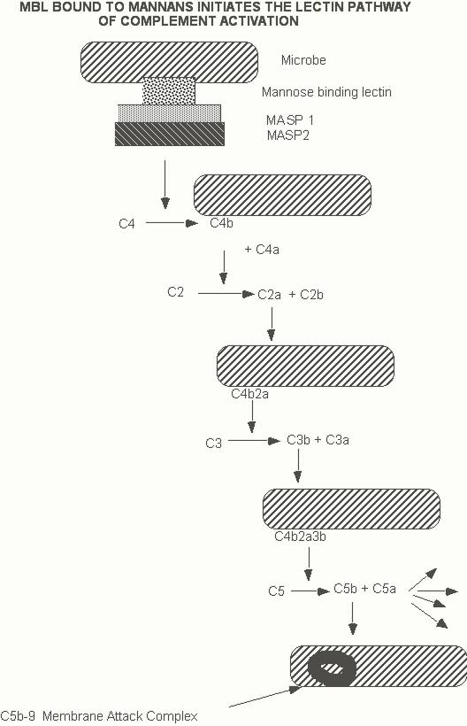 Figure 4. The lectin pathway of complement activation. MASPs are proteases that associate with mannan bound MBL. C5a is a potent soluble chemoattractant that contributes to the inflammatory process.