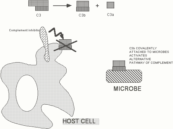 Figure 5: The alternative pathway of complement may be activated on microbial surfaces in the absence of antibody. Self non-self discrimination by complement occurs because host cells express complement inhibitors