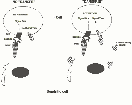 the ability of B cells to be triggered. We will discuss how this happens in more detail in the lecture on B cell activation. T cell activation requires two signals. The first signal (SIGNAL ONE) is delivered by the T cell receptor which recognizes antigens bound to MHC molecules. The second signal (SIGNAL TWO) is delivered by costimulatory receptors which respond to costimulatory ligands on antigen presenting cells. If the host does not sense "danger" i.e. pattern recognition receptors are NOT activated, costimulatory ligands such as B7.1 and B7.2 are not expressed and T cells cannot be activated. When microbes induce the expression of costimulatory ligands, T cells are activated and an adaptive immune response ensues. Clearly this is an important mechanism for discriminating between self and non-self.