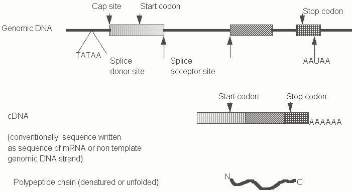 The primary structure of a protein is its amino acid sequence. The most common way a protein's primary structure is determined today is by cloning a cDNA that encodes this protein. It is useful to have a clear picture of what is meant by the terms genomic DNA and cDNA. A promoter is a site at which (DNA dependent) RNA polymerase initiates transcription making an RNA copy of one strand of genomic DNA. Most eukaryotic promoters contain an AT rich sequence known commonly as a TATA box. Proteins that contribute to the basal transcription machinery direct RNA polymerase II (the enzyme responsible for initiating transcription of most genes) to initiate transcription about 30 basepairs downstream of the TATA box at the transcriptional initiation site (cap site). The primary transcript is processed in three ways - it is capped at the 5' end, spliced (introns are removed) and polyadenylated at the 3' end. The processed transcript is known as mRNA (messenger RNA). In the laboratory an enzyme known as reverse transcriptase (RNA dependent DNA polymerase) is used to convert mRNA into a complementary copy known as a cDNA. The set of cDNAs from B lymphocytes, for instance will include antibody genes but these genes will not be found in cDNA libraries from hepatocytes or muscle for instance. Looking at a cDNA sequence (or the predicted primary structure) can often reveal important information about the protein of interest. Homology to known cDNA sequences can yield clues to structure and function.