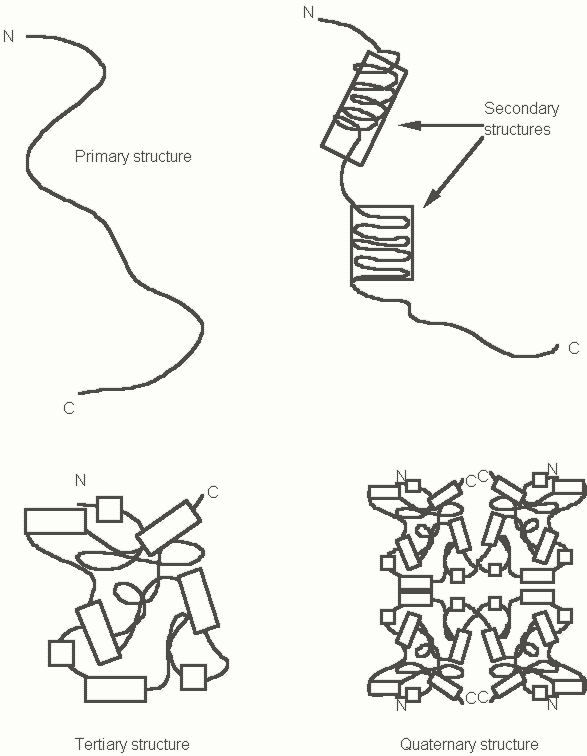 2. Review some basic concepts in protein structure. What do you mean by primary, secondary, tertiary, and quaternary structure? You should know the basic structure of an amino acid, be able to define what an "R" group is, and be able to identify in a general way some of the characteristics of R groups - e.g. lysine and arginine have positively charged R groups.