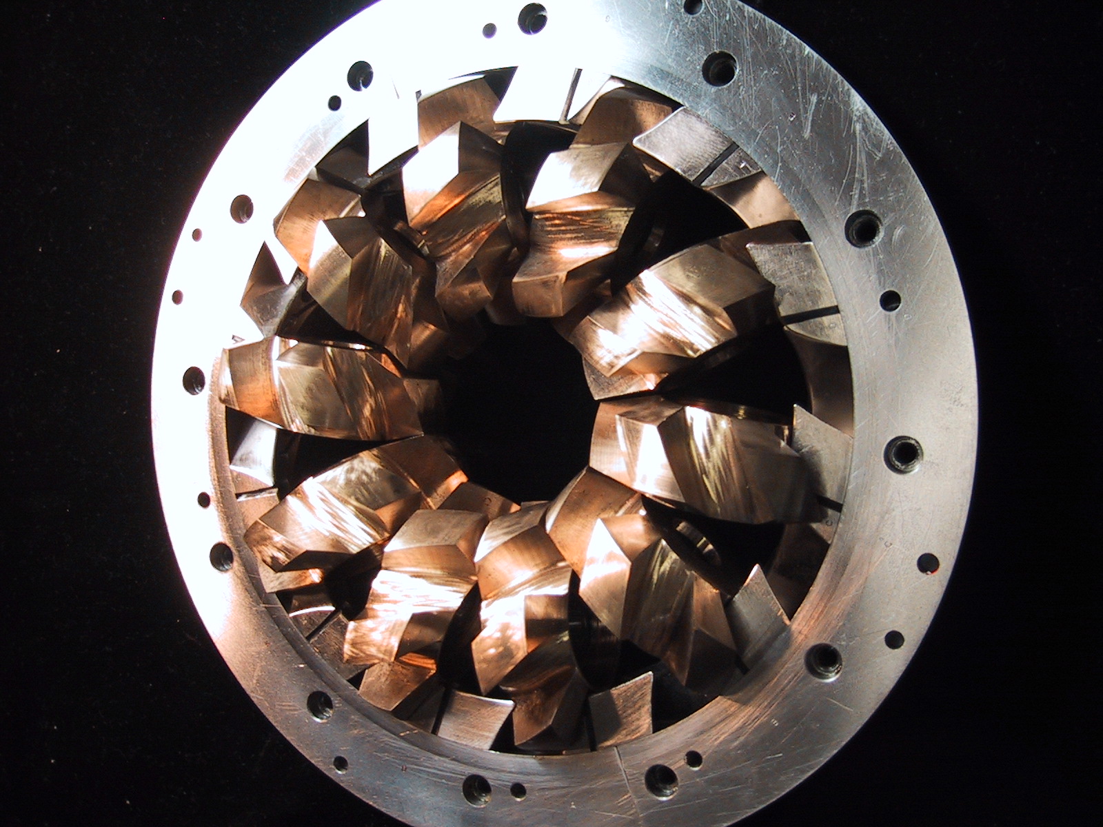 - This image shows the heart of the system. The rotation of the outer steel ring drives the rotation of each of the smaller bronze rotors. As the "teeth" of these rotors mesh and unmesh, they open and close a series of compartments between them; air is expanded as these compartments open, and compressed as they close. I did not design these parts myself, but I included the picture to give a better understanding of the project. And it does make a very nice image.