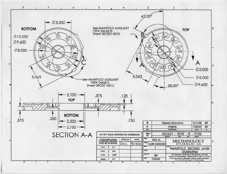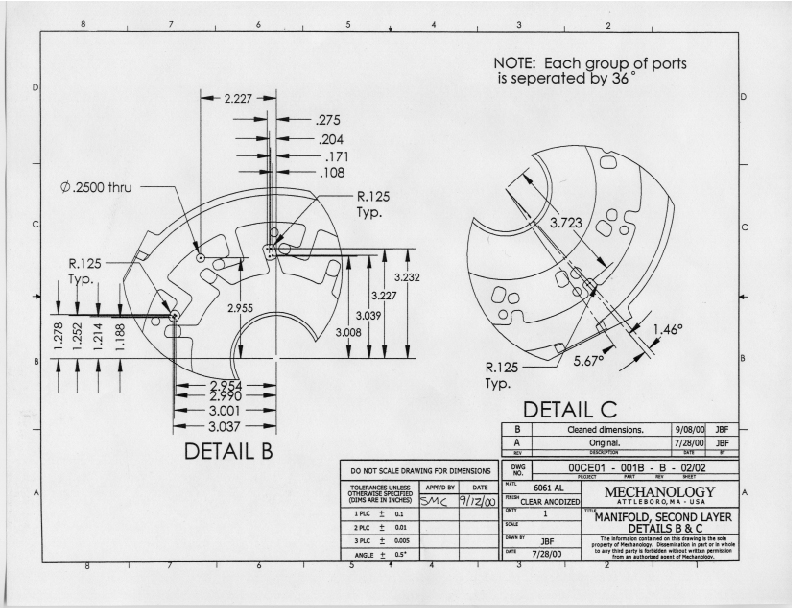 - Because the compressor used ten small rotors working in parallel to compress a larg volume of air, the manifold was needed to funnel air between a single source and each of the the compression and expansion chambers. For ease of construction, it was built in three parts. This is a drawing for the middle layer of the Manifold.