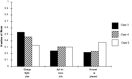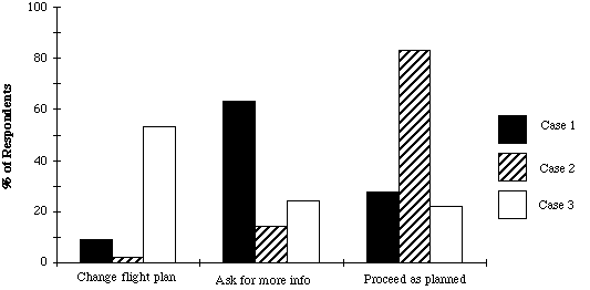 In each scenario, respondents were asked to choose one of three options: proceed using the current flight plan, change the flight plan, or request more information. In addition, there was space for pilots to specify the type of information they would request and to give general comments with regard to the scenario.
