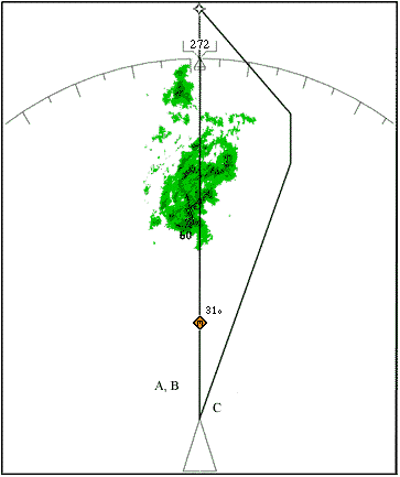 The scenarios were presented with a light weather picture which showed an entirely green cell. Additionally, the scenarios involving Route A were repeated with a slightly worse weather display reading in order to explore the effect of harsher weather on the replanning process. This weather cell included some areas of yellow along the route of flight.