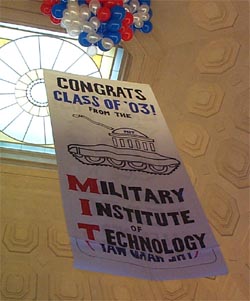 In response to a recent $50 million grant from the US Army to MIT's Institute for Soldier Nanotechnology, a graduation day hack re-named the school the 'Military Institute of Technology'. Students noted that ISN's mission of "outfitting the soldier of the future" stood in stark contrast to the Bush Administration's abandonment of the soldiers of the past--the President's 2004 budget to Congress cut veterans' benefits as many of our nation's veterans are homeless and in need of assistance.