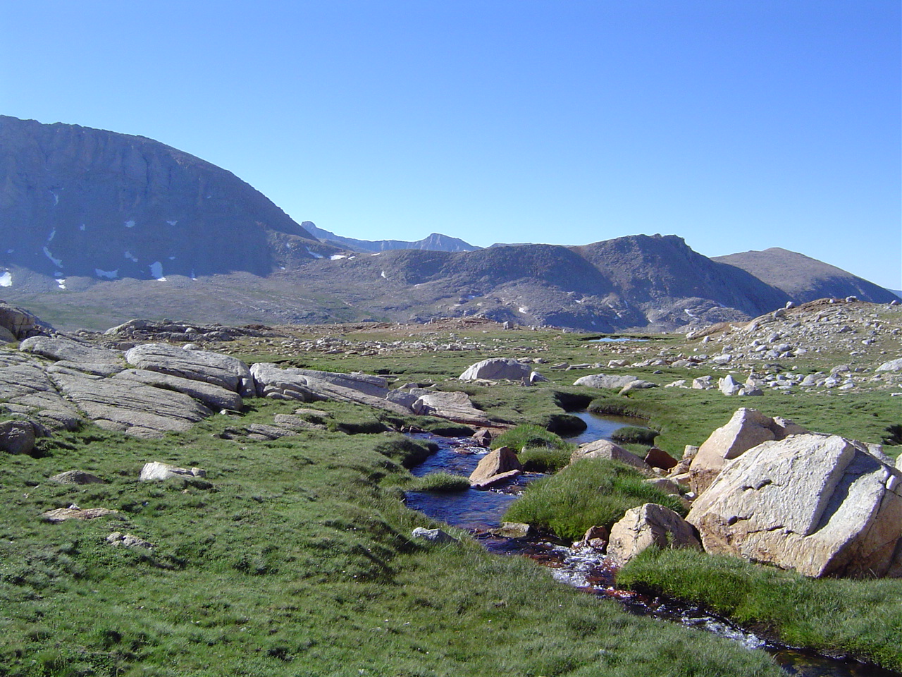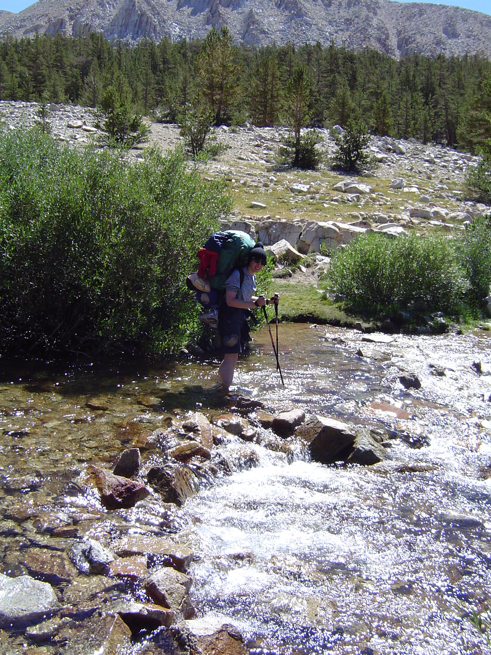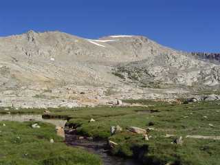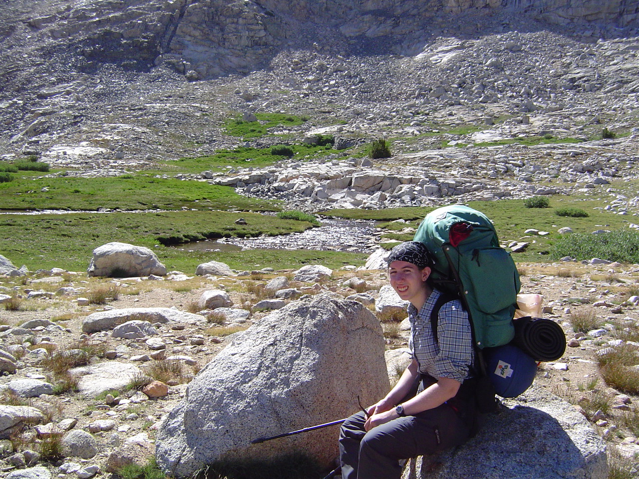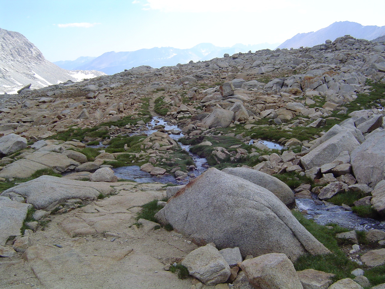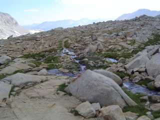 | Day 6: The stream near our camp, which is actually the headwaters of Tyndall Creek, which is the headwaters of the Kern River. From this acorn may grow a mighty oak? |