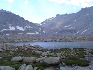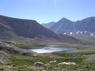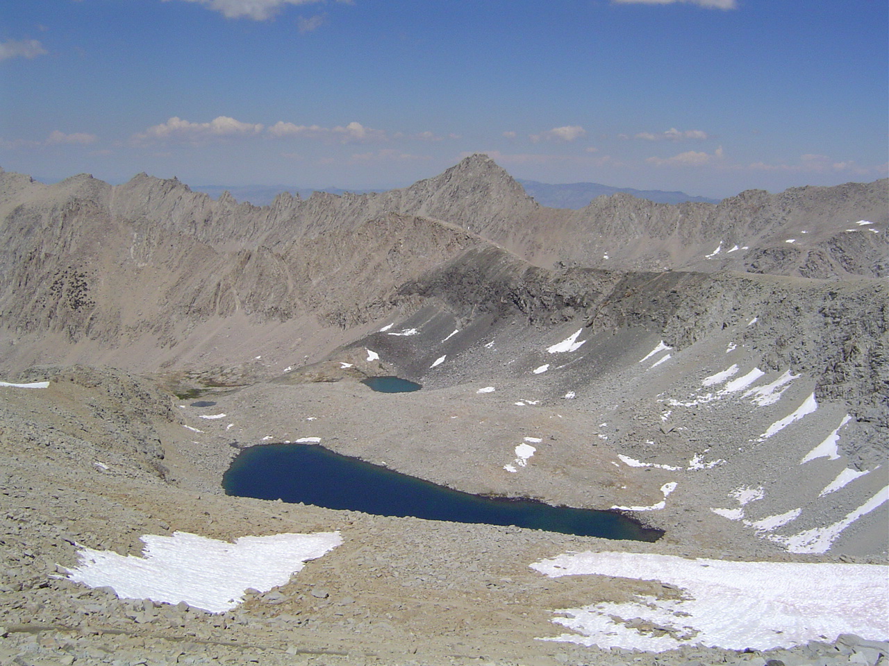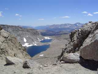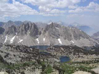 | Day 4: The Kearsarge Lakes - often seen, never visited until now; Kearsarge Pinnacles in the background. The lakes are lovely, and we always did wonder what would happen if we climbed down the other side of the pass and backpacked here - finally! Our great adventure begins. |