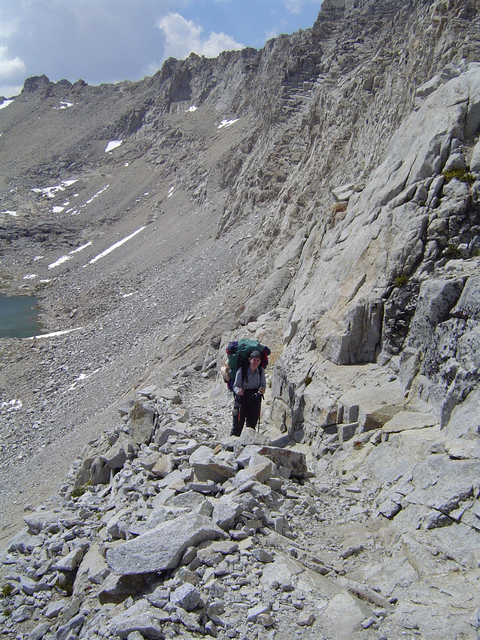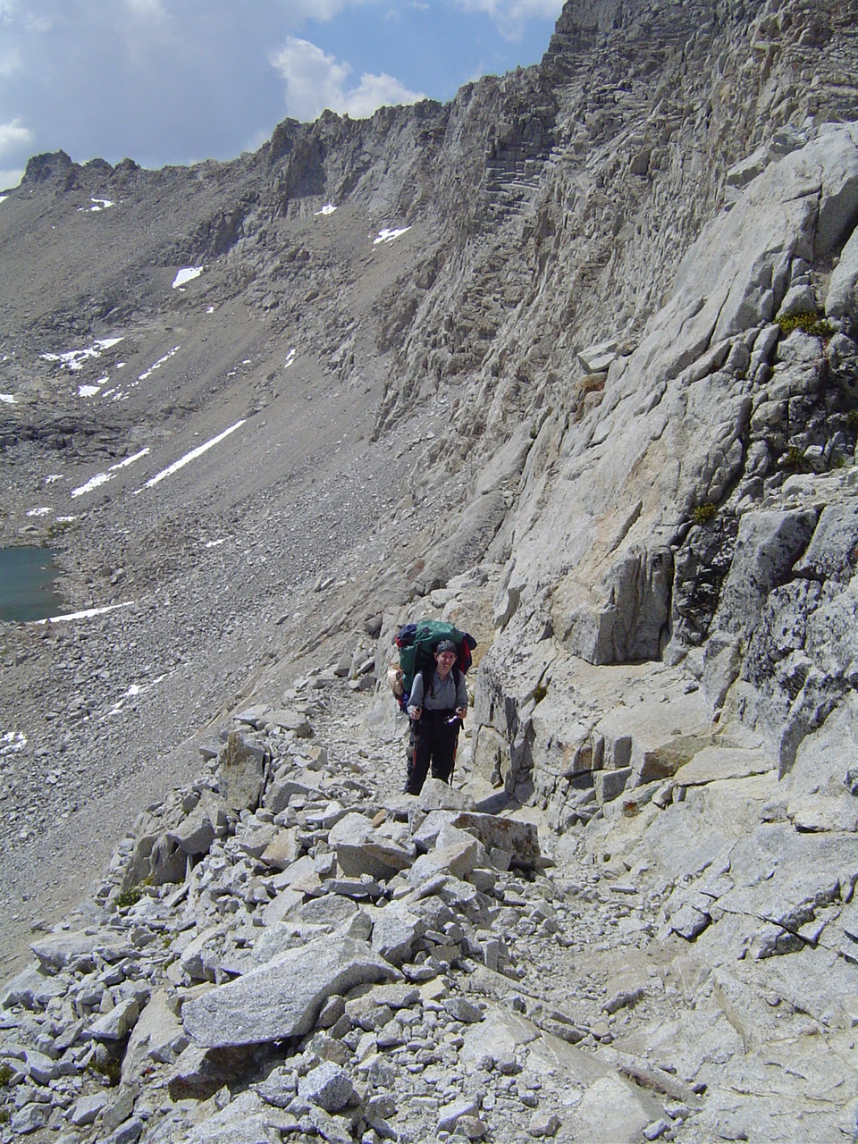 | Day 5: The trail down was literally blasted out of raw granite cliffs, and was very steep and scary for us acrophobic folk. Walking on a 2-3 foot wide trail about a 1000 foot dropoff is enough to give anyone nightmares. |