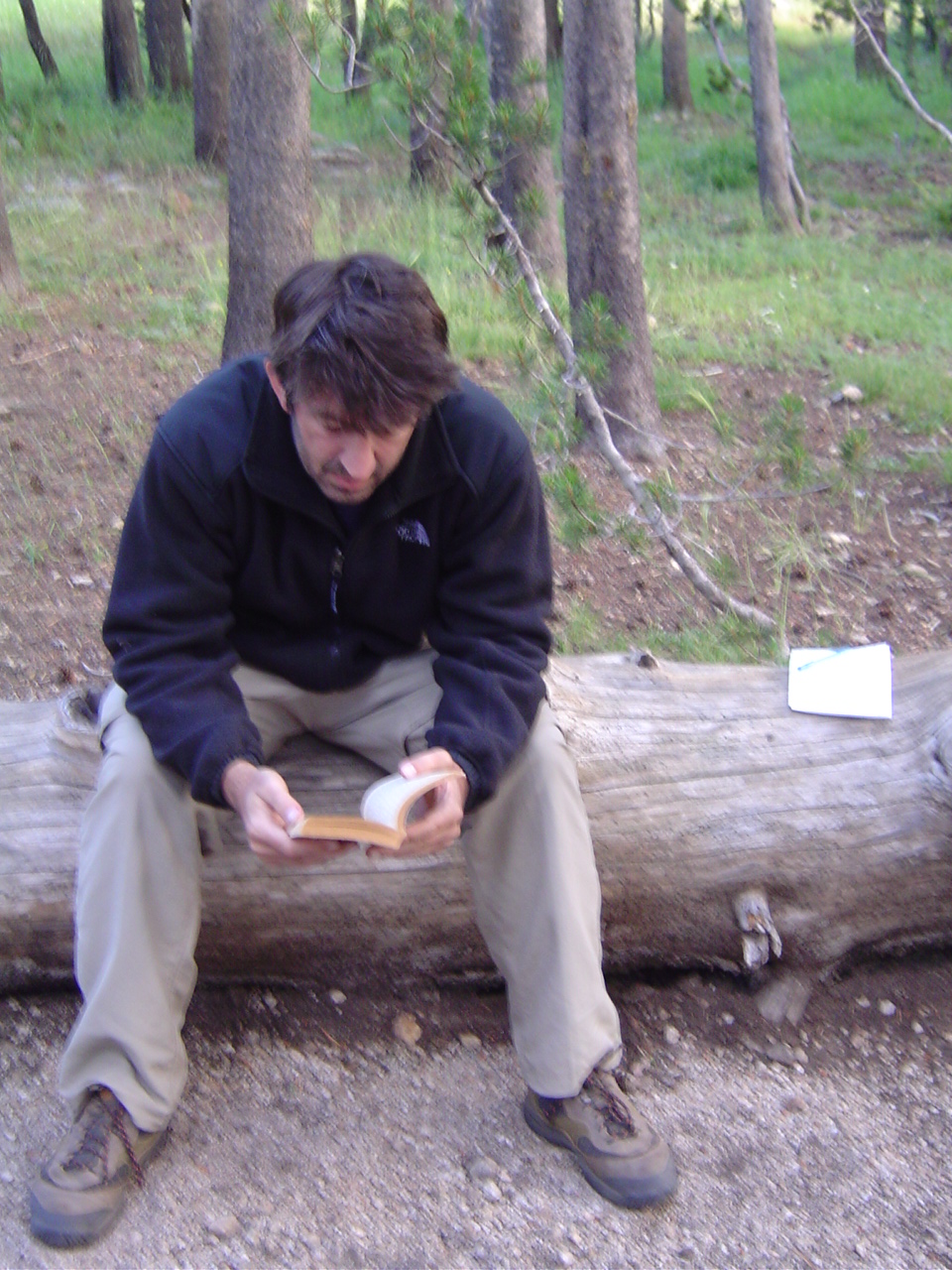 | Day 7: At Rock Creek; my father is reading our sole shared form of literary entertainment - a copy of Hermann Hesse's Narcissus and Goldmund. |