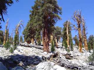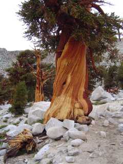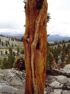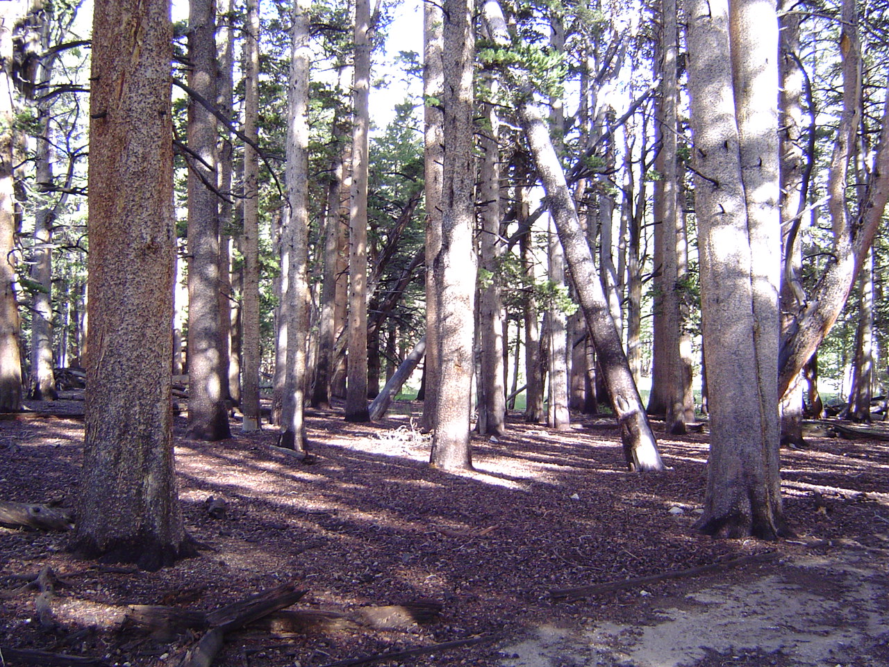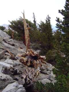 | Day 6: What trees survive near treeline are generally very strangely twisted; these ones haven't seen much wind, but have clearly seen a lot of lightning over the years. |