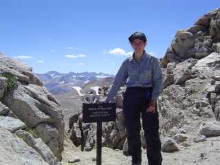 | Day 4: Kearsarge Pass - so close and yet so far! No more trees until later this afternoon. It started getting windy, and I started getting kind of tired here. More blood sugar needed - my first energy bar ever was consumed about 20 minutes later at the top of the pass. |