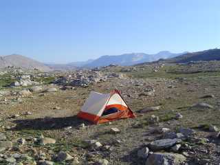 | Day 5: Our little tent looks very lonely out here in the high country. We haven't seen anyone since the top of the pass, and we won't encounter other hikers until about 1000 the next morning. |