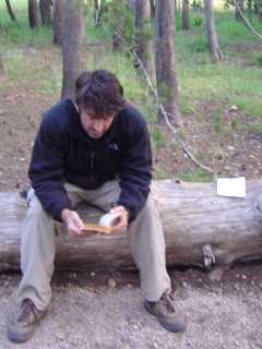 | Day 6: Our camp tonight had a wonderful rock ledge for spying on hikers from. I felt like a mountain lion. My father apparently feels tired and content. |