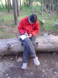 | Day 7: I, meanwhile, am writing in a journal in preparation for putting this website up someday. The journal was also useful for other things, like writing down email addresses and adding up trip milages. And an emergency firestarter if things got desperate, which they didn't. |