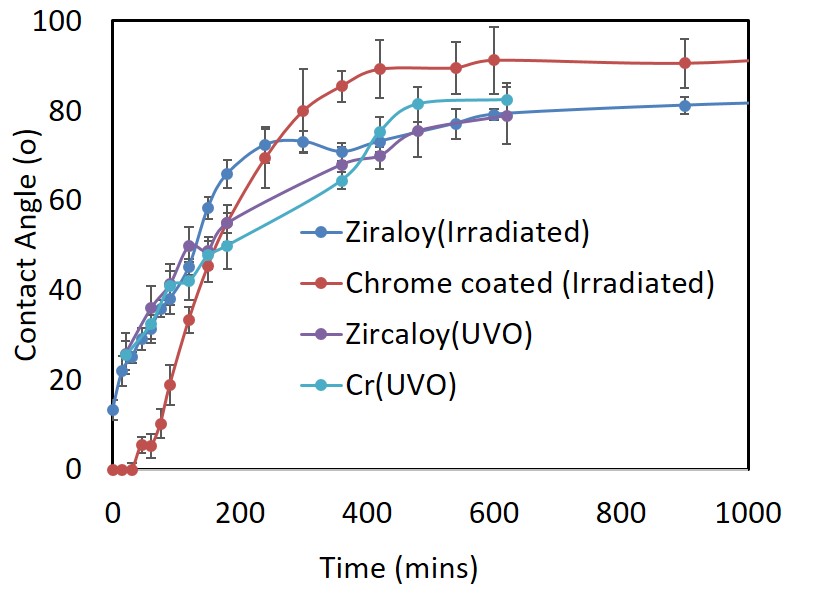 Utilizing unique facilities at MIT, the heat transfer surface wettability in characterized after exposre to prototypic nuclear environment (Neuron/Gamma/Oxidation/CRUD/ etc.)