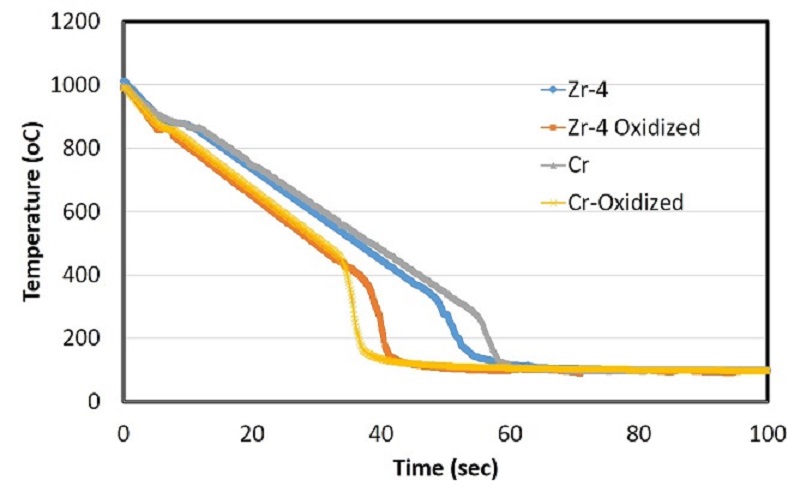 Temperature vs. Time for quench heat transfer of Zr-4 vs. Cr.