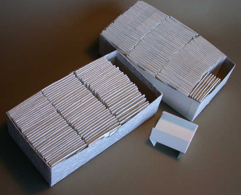 Anyway, Jeannine has decided that she wants to finish the darned thing, so I was helping her out and folding some cards to use in the construction. It's a fine thing to keep one's fingers busy while sitting in front of the TV. That's one box worth (500, I think) of business cards, folded into sponge-bits.
