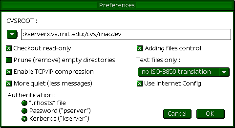 Do not download the version of MacCVS available on the Internet, as it does not have Kerberos support built in. The sources available on the Internet are likely to be out of date, as the current sources are kept on our CVS server.