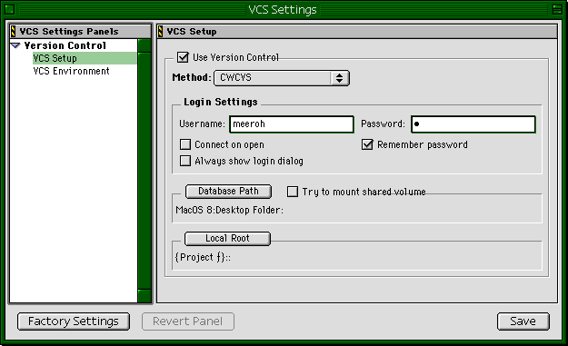 In order to configure a project to use CWCVS, open the project in the IDE and select "Version Control Settings" from IDE's Edit menu. In the "VCS Setup" preferences panel, enter the following settings: