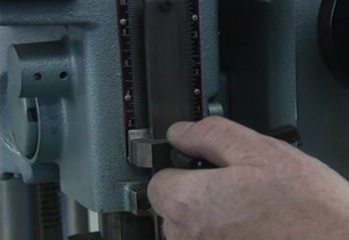 On most machines the power feed will be marked with a knob marked "in" and "out." To get it started, turn the machine on and turn this knob to "in." This will engage the powerfeed, and the machine will feed the drill for you in a much more controlled manner than you could feed it. | ||