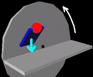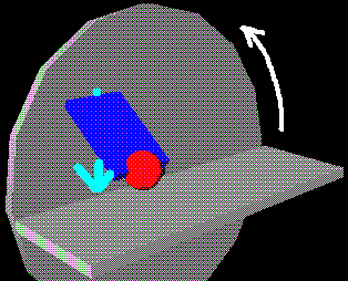 The following figures illustrate the possible situations on a round sander, with the position of a person's hands (red sphere), the work piece (blue rectangle), the direction of the machine (white arrows), and the resulting situation if the person lost control of the work piece (aqua arrow).