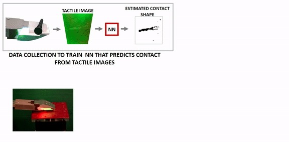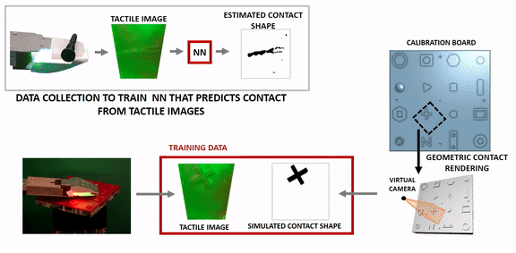We provide some basic code that computes given a tactile image, the resulting local contact as a heightmap, and the 3D models of the objects used during training. Code . We will soon make available data of tactile images and their corresponding simulated contact shapes.