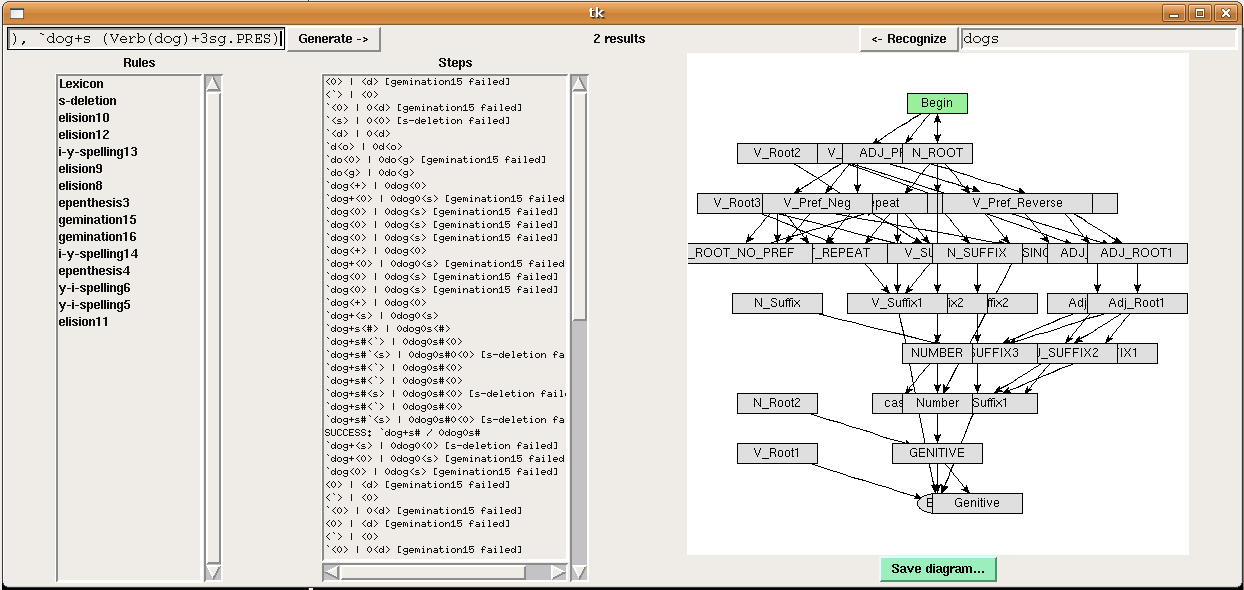 `dog+s (Noun(dog)+PL). I added "dog" as a verb by putting