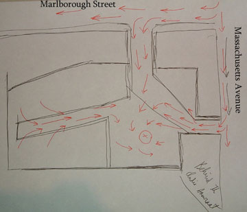 Through Grant's awareness of the invisible, he was able to explain the pile of debris in the middle of the alley. It corresponds to the circle with the "x" in it from the picture above, and he says, "The center of the whirlwind can be seen (and shown to not be a temporary occurrence) by the deposits of debris..."