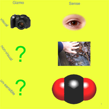 They didn't touch or smell anything. I wonder how the process would differ if there were a camera-like tool that could help frame the nonvisual aspects of the landscape? If a camera is for the visual, what device would capture other sensory data like temperature? Ryan was able to talk about relative average temperature over the course of days through the presence or absence of snow on one side of the street vs. the other. What would Ryan do if he could sense temperature more directly and take a "picture" of some sort to help tell his story? What about the things in the environment that we can't sense at all, like C02? Could we take pictures of that?