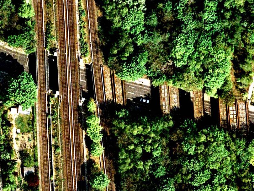 Active S-bahn tracks lie side by side with long abandoned tracks at the southern tip of the Sudgelande Nature Park in Berlin. (Source: Google Earth, Accessed 1/10/08) |