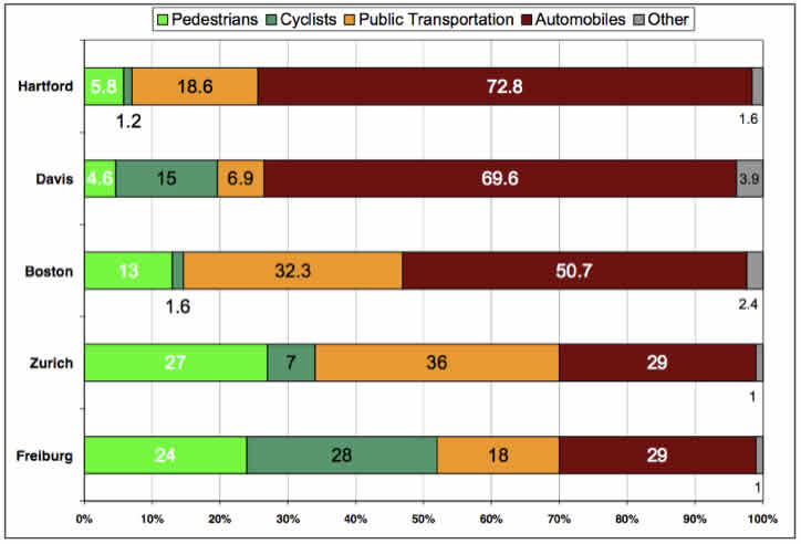 Freiburg's modal split compared to other cities in Germany and the United States.