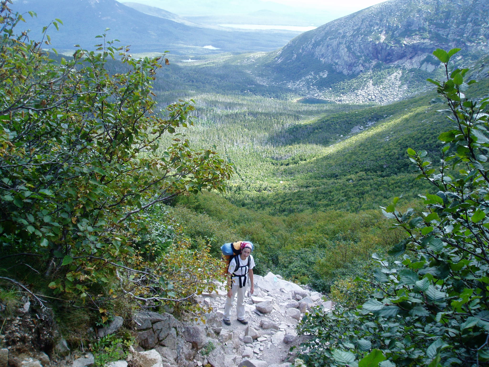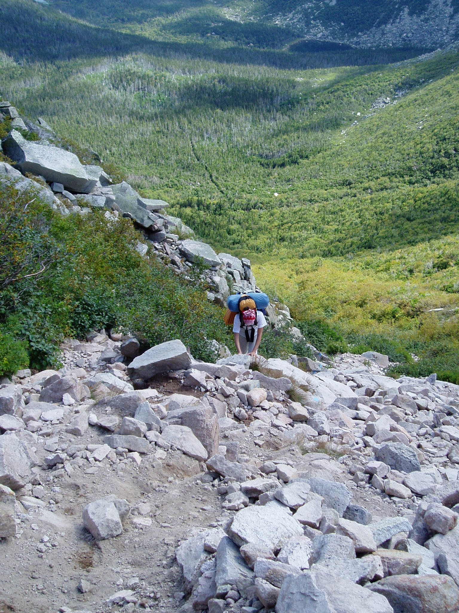 We had already been down the Saddle Trail the night before, so we knew what to expect, but now we had our backpacks (with our tent, sleeping bags, food, clothing, etc.). Despite the extra weight and the fact we had to climb steep rocks, we made decent time, and we were at the "Saddle" before noon on Saturday. According to the AMC booklet, it was 6 hours to Russell Pond.
