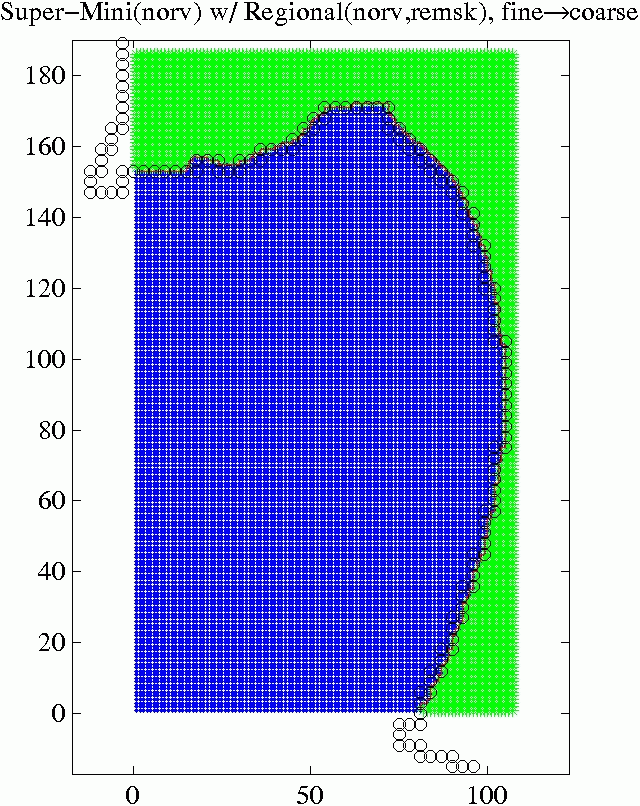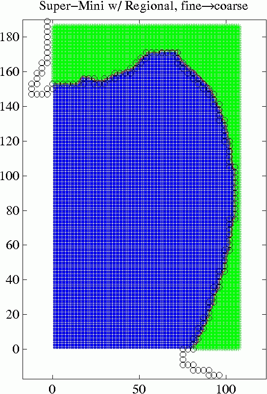 The following is an example of why it would be more efficient to mask nested domains simultaneously. The mask on the left shows sharp turns into the open water immediately outside of the nested sub-domain. The mask on the right retreats these turns one grid-point away.