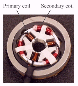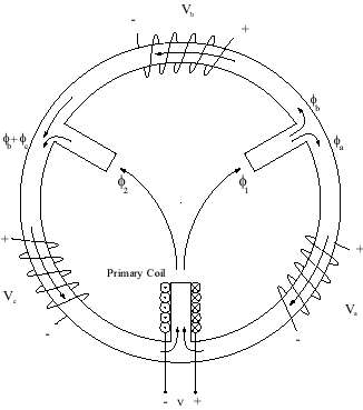 A Three-Phase Sensor, opened to show three primary coils on the poles, and three secondary coils on the ring