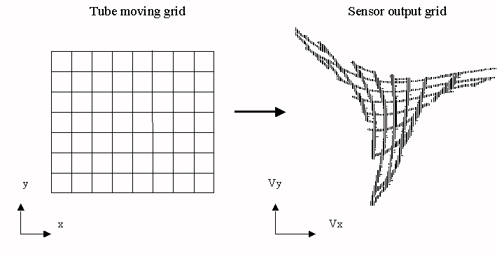 Experimental output of sensor: when the tube is moved at 1mm grid (left), the sensor output of Vx vs. Vy is shown (right)