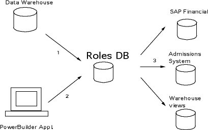 The following diagram shows the main areas where data flows into and out of the Roles Database.