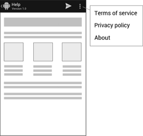 Build a help screen in your app and offer other options in the action bar. For example, you could let users contact you with questions or feedback through an action button. The action overflow is the ideal place for non-help information that users rarely need.