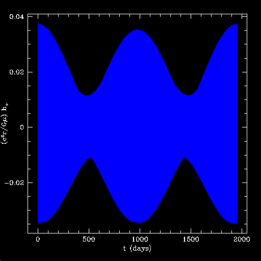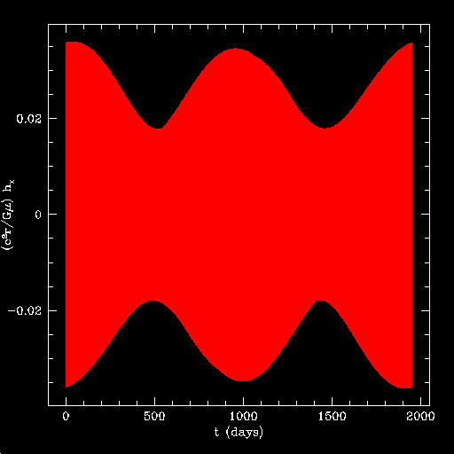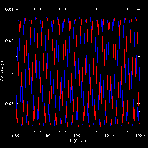 This waveform is observed in the hole's equatorial plane. The blue lines are h+, the red lines h×. The low-frequency amplitude modulation is due to Lense-Thirring precession, i.e. the dragging of the orbit's nodes by the black hole's spin. The frequency of this modulation is 2 × (Omegaphi - Omegatheta) = 3.66 × 10-6 M-1. This difference is rather small in this weak-field region; thus, orbital precession is rather slow, and there are many cycles in each peak.
