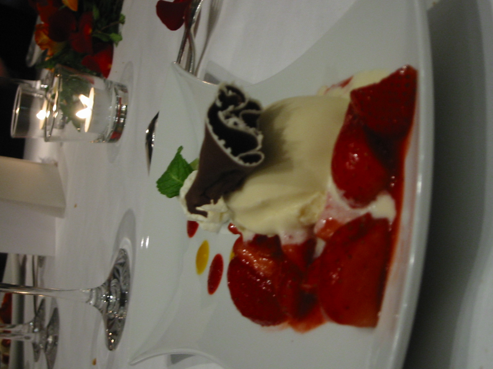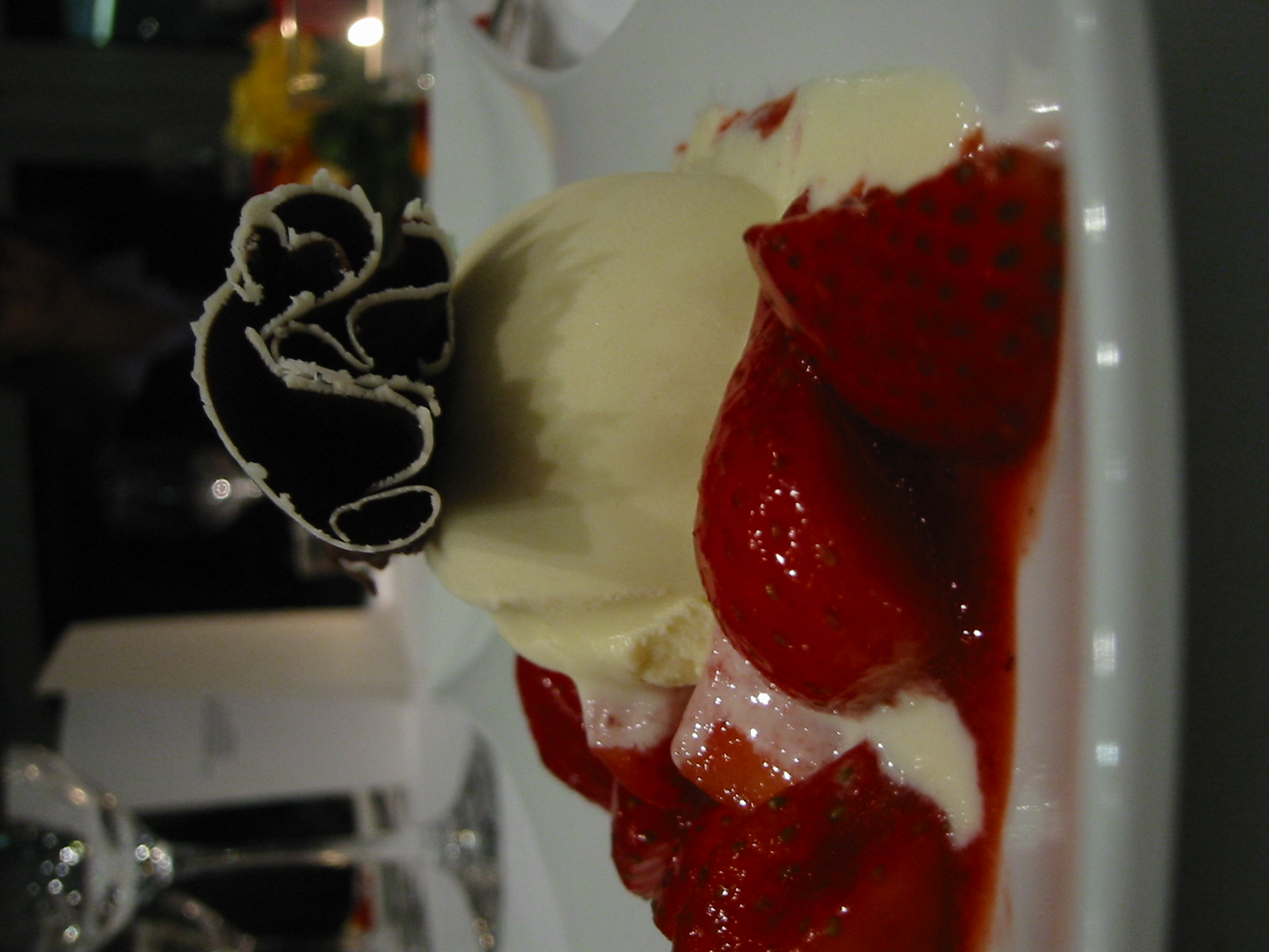 When we had our fancy dinner at Daimler-Chrysler the last night in Stuttgart, they had a dessert with a chocolate ruffle on it, so I had to take a picture. I can't tell if they used your kind of ruffle or simply did the chocolate curler kind of thing and then dipped the edges in white chocolate. The ice cream was a vanilla with a somewhat rummy flavor. Very nice.